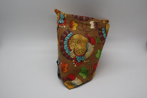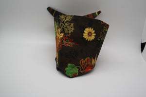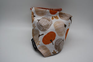 This bandana features acorns on a white background with pumpkins, leaves, flowers and patterns in fall colors on a brown background for the backside.